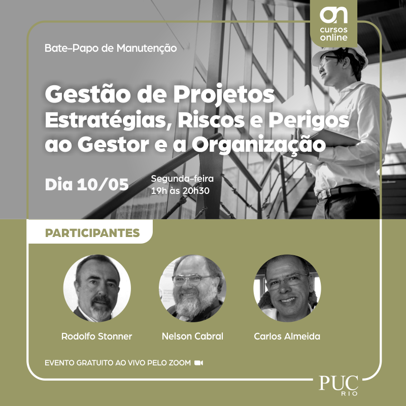 No dia 10 de maio de 2021, no horário das 19h, o CCE-PUC-Rj estará promovendo o bate-papo de manutenção com os professores, Rodolfo Stonner, Nelson Cabral e Carlos Almeida, não percam essa oportunidade.
