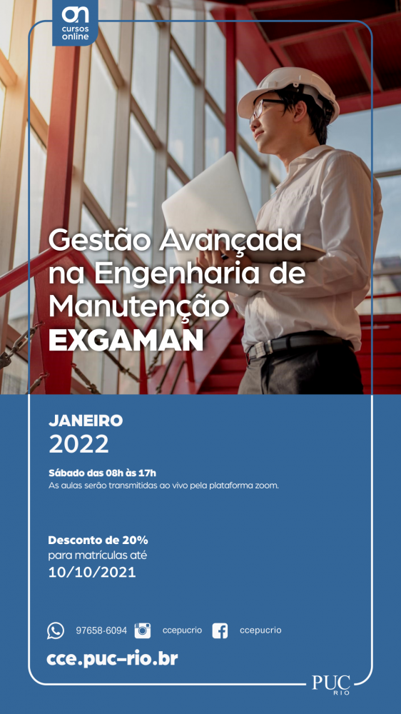A CCE-PUC-Rio estará lançando em janeiro de 2022 a segunda turma do curso de gestão avançada em engenharia de manutenção, uma atividade promovida pela CCE-PUC-Rio, busque por maiores informações no LINK 2a. turma do Exgaman