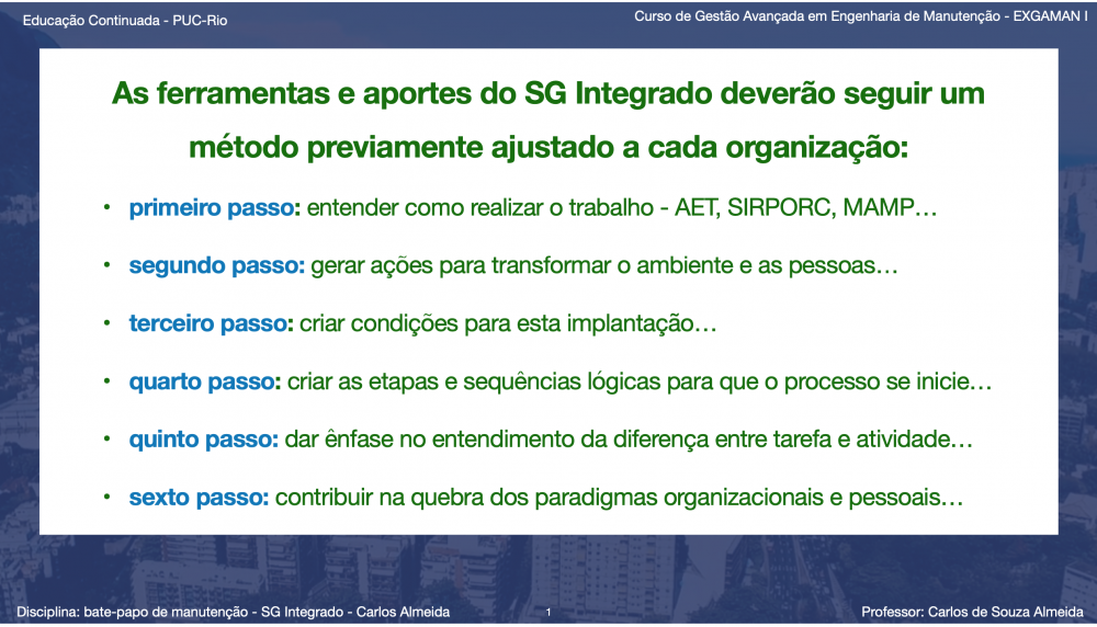 Para que o Sistema de Gestão Integrado fosse possível de ser desenvolvido, em continuidade ao trabalho realizado com os servidores do HUCFF, entre os anos de 1994 a 1998, ingressei no Curso de Especialização - MBA em Engenharia de Manutenção, tendo algumas disciplinas um grande diferencial, como por exemplo: