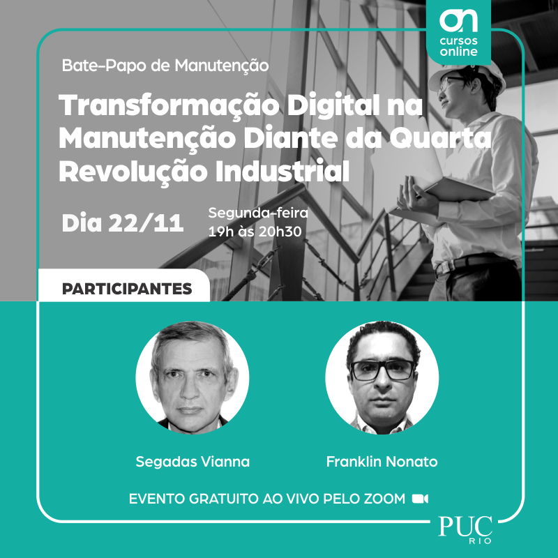 Não percam a excelente oportunidade gerada pela CCE-PUC-RIO, com o Bate-papo de manutenção, com o tema Transformação Digital na Manutenção - Estamos diante da 4a. Revolução Industrial e você o que está esperando para se inscrever neste evento que é gratuito.