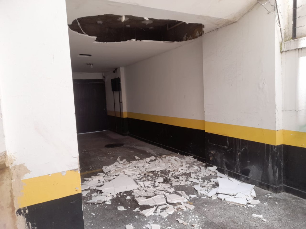 Foto 8: Vista do desabamento do forro de gesso na garagem - Vazamento - RJ - Ausência de Manutenção.