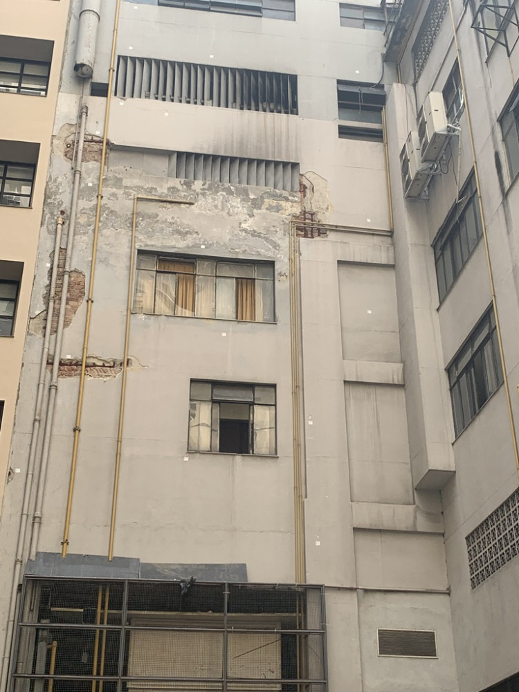 Foto 5: Vista da fachada externa de prédio no Centro do RJ - Ausência de Manutenção.