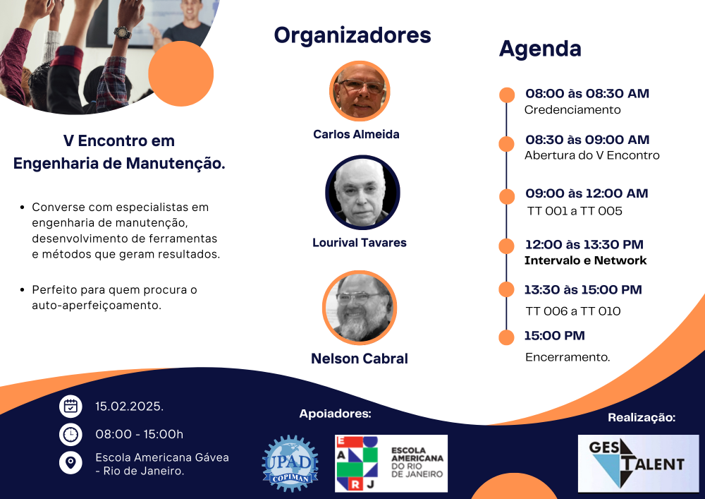 Agora em 2025, no dia 15.02, estaremos realizando o V Encontro em Engenharia de Manutenção, nosso objetivo é repetir, o sucesso dos eventos anteriores, na certeza de que o evento presencial agregará muito valor a proposta de desenvolvimento técnico dos profissionais.